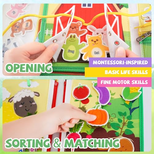 Newly Upgraded Farm Busy Board Backpack: This busy book is packed with 10 pages of 20 engaging activities that reflect the joys of farm life. Each activity allows toddlers to explore essential real-life scenarios, enhancing their hand-eye coordination and self-care skills. The design aims to foster a proactive spirit of learning—an essential trait for young minds.