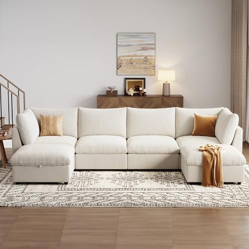 The LINSY HOME Modular Sectional Sofa is designed with a versatile approach to comfort and style. Its modular structure allows users to configure the sofa in various arrangements to fit their living space perfectly. This adaptability makes it suitable for different environments, whether it's a compact apartment or a spacious family room. The sofa consists of oversized seating, featuring deep cushions filled with high-density memory foam and fiber, providing cloud-like comfort for users. It also includes two storage ottomans that not only enhance seating options but also provide hidden storage, ideal for stashing throw blankets and cushions. The sofa's unique design includes changeable corduroy covers that are removable and washable, allowing users to refresh the look of their space easily. Additionally, the sofa features a stylish sloped armrest that promotes an ergonomic seating posture, enhancing the overall lounging experience. With easy assembly that requires no tools and the ability to ship in multiple boxes for convenience, the LINSY HOME Modular Sectional Sofa combines functionality, comfort, and chic design, making it an ideal choice for any living room.